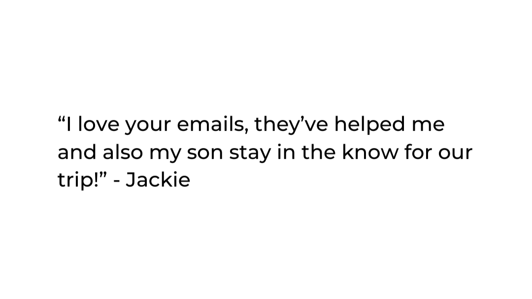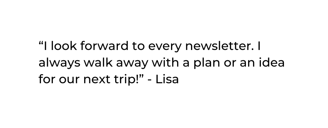Each week, I’ll send you an email with a blend of travel inspiration, destination highlights and insider tips, occasional Disney, cruise, and Universal updates, packing suggestions and travel hacks, special offers and deals when they’re available, real travel stories from past clients, and practical advice to make planning feel effortless.